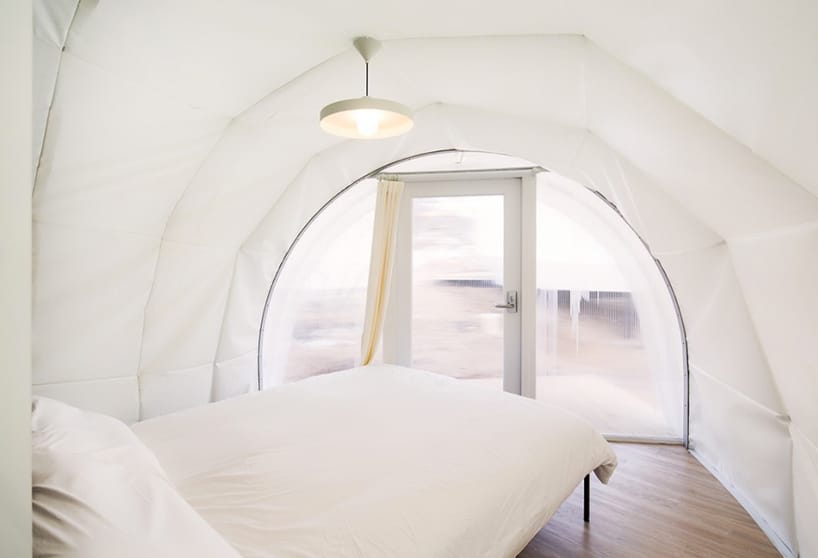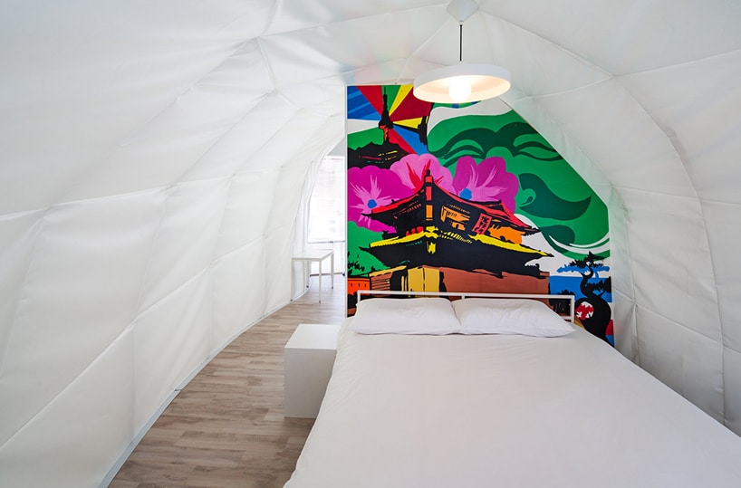Toutes les tentes sont livrées avec des canapés qui se transforment en lits, des salles de bains et des œuvres d’art créées par des artistes locaux à Séoul.