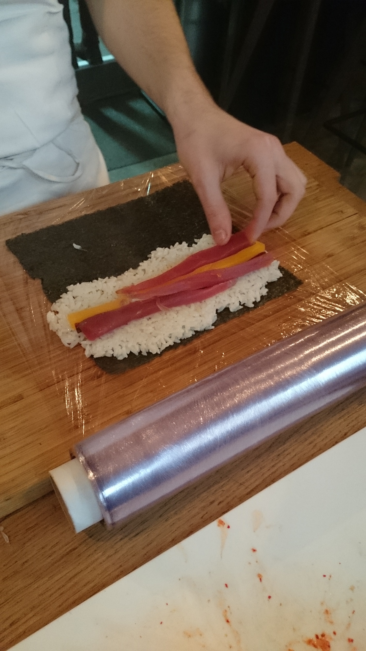 Nous avons pu manier le Kimchi et le thon frais, toujours avec précaution sous l’œil du chef ! Le chef nous a parlé de la préparation du kimchi, comment il est préparé en avance, j’ai trouvé cela très instructif, rien de mieux que de manger du kimchi maison !
