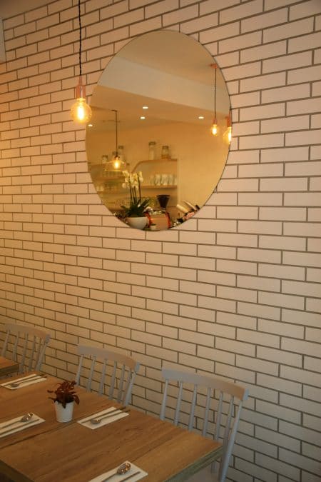 Le lieu est très épuré, des tables et des chaises de couleur blanche, des petits pots de fleurs disposés sur chaque table.