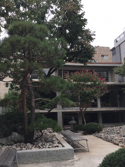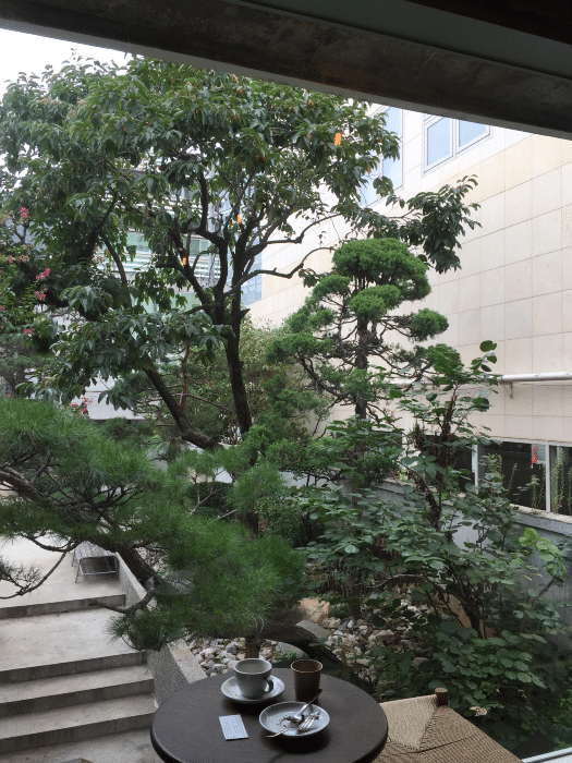 Un des rares cafés à ouvrir assez tôt le matin est Anthracite juste à la sortie du métro Mangwon-dong. C’est un immeuble entier sur 3 étages, très vaste donc il y a de la place à toute heure de la journée. Ils ont plusieurs adresses (dont un à Hapjeong pas très loin dans une ancienne usine de chaussures) mais celui-ci a une baie vitrée avec vue sur de magnifiques pins coréens qui me rappellent la campagne. Idéal pour commencer la journée apaisée et caféinée 😉