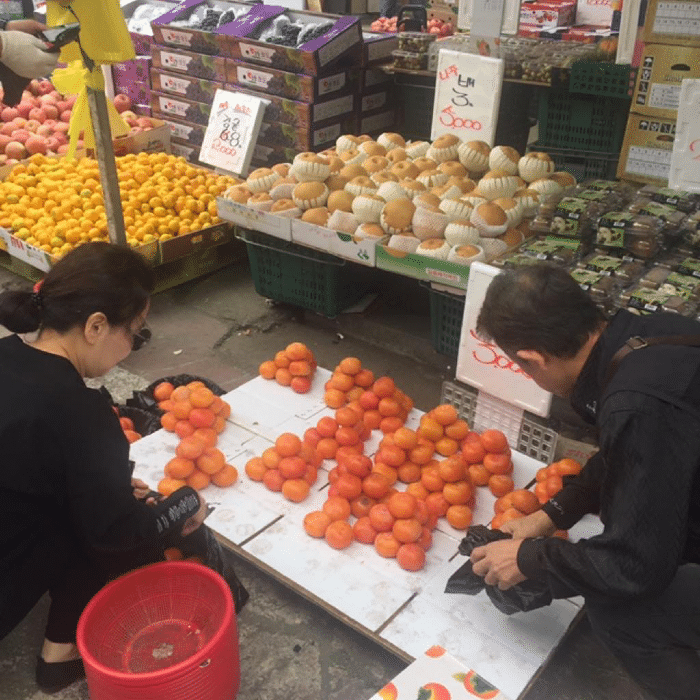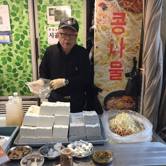 C est un marché typique qui me rappelle beaucoup celui que je fréquentais à Daegu. On peut déguster un délicieux bol de nouilles pour moins de 6000W (très rare ces derniers temps à Séoul), voir les Ajummas et Ajossi préparer des galettes de riz, concocter divers banchan qu’on peut acheter à emporter. Les chaînes de TV viennent souvent filmer ici pour les foodies en quête de “Mat-jib” (맛집 = littéralement “délicieuse maison”) et résultat il y a  souvent la queue sur certains stands de nourriture. Rassurez-vous, l’attente est courte, les Coréens ne s’attardent pas!