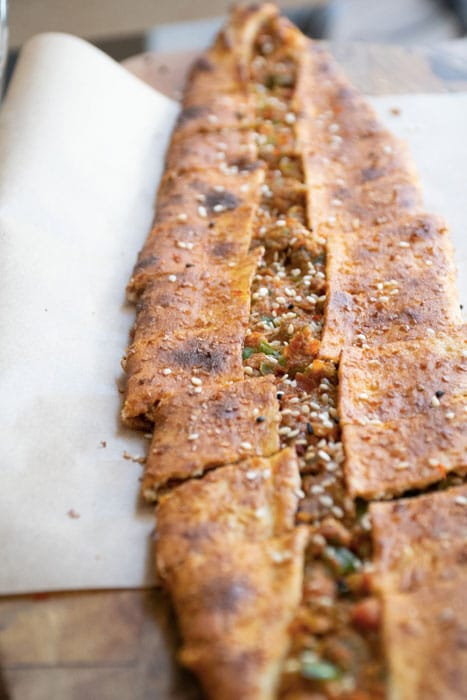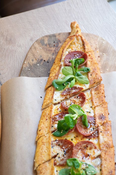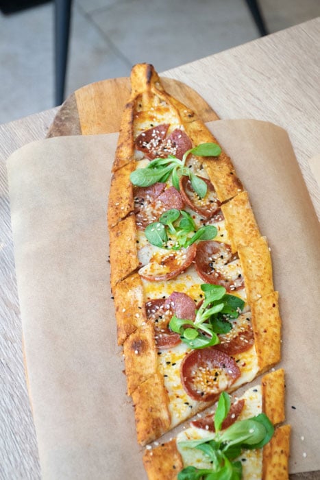 –Pide Sucuk à base de saucisse de bœuf grillée, mâche et fromage Kaşar