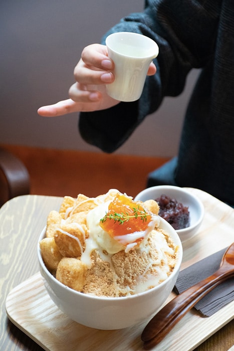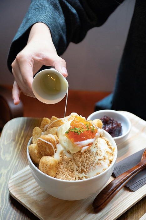 -Le Dabang Bingsu : un bingsu (glace pilée) au thé noir, des biscuits injeolmi, une boule de glace à la vanille et du miel en rayon à 10 euros
